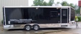 Flat Nose Racer Package - 7 Foot Interior Height - Choice = Black Coin Or Spray-On Floor & Ramp - Transition Flap - .040 Screwless Side Metal - Polished Rear Header - Aluminum Wheels - .030 White Aluminum Ceiling And Sidewalls - 30 Amp Breaker Box And Power Cord - 110V Interior Receptacle X 3 - 110V GFI Exterior Receptacle X 1 - 48" Fluorescent Light With Diffuser & Switch X 2 - Halogen Flood Lights X 2 - 8 Foot Upper Cabinet - 8 Foot Lower Base Cabinet - Bogey Wheels X 1 Pair